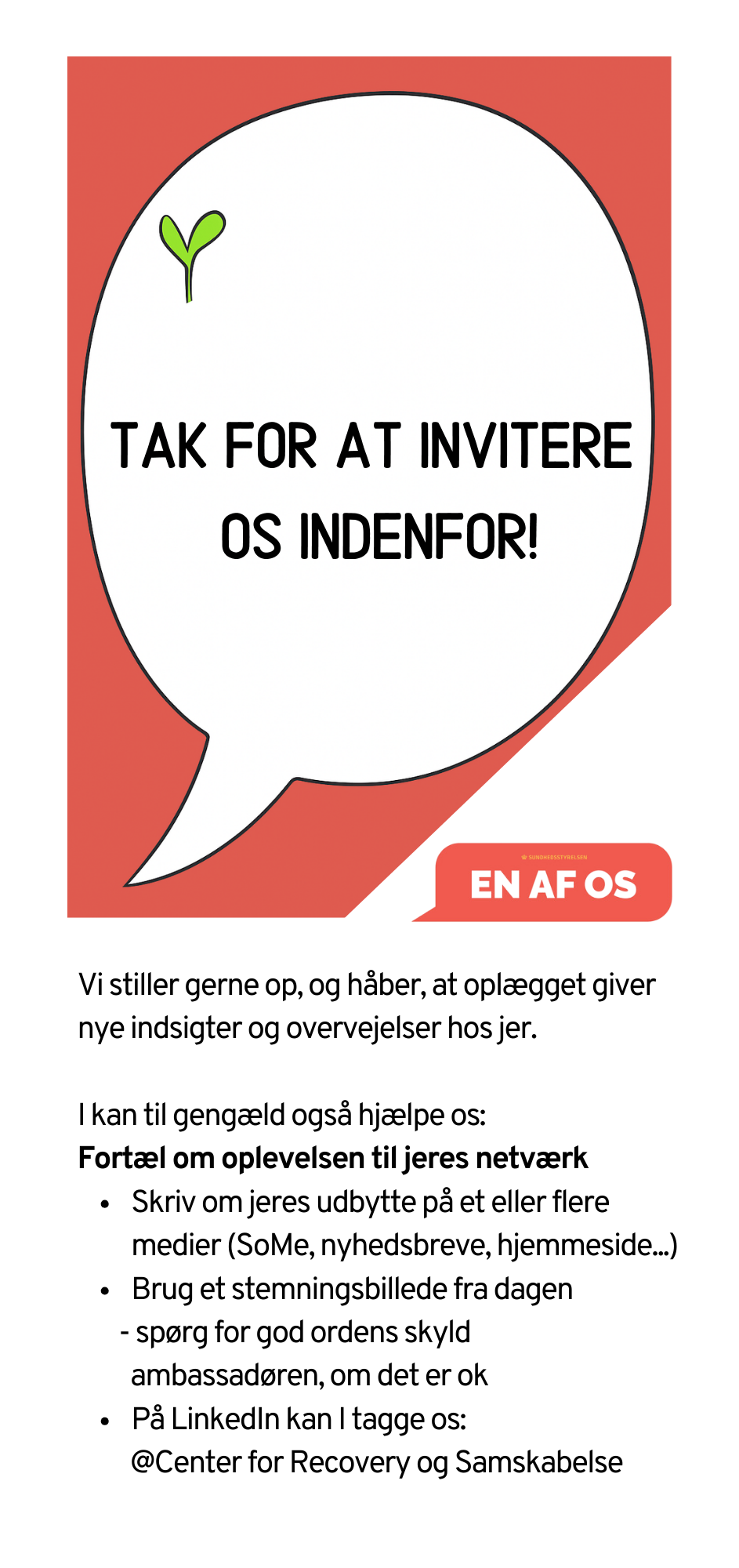 Ambassadørerne holder oplæg for både større og mindre forsamlinger, fx på en uddannelsesinstitution, en arbejdsplads eller et jobcenter. Oplægget kan fx være en del af personalemøder og temadage eller fast indslag i aktiviteter for fx nye medarbejdere eller studerende.