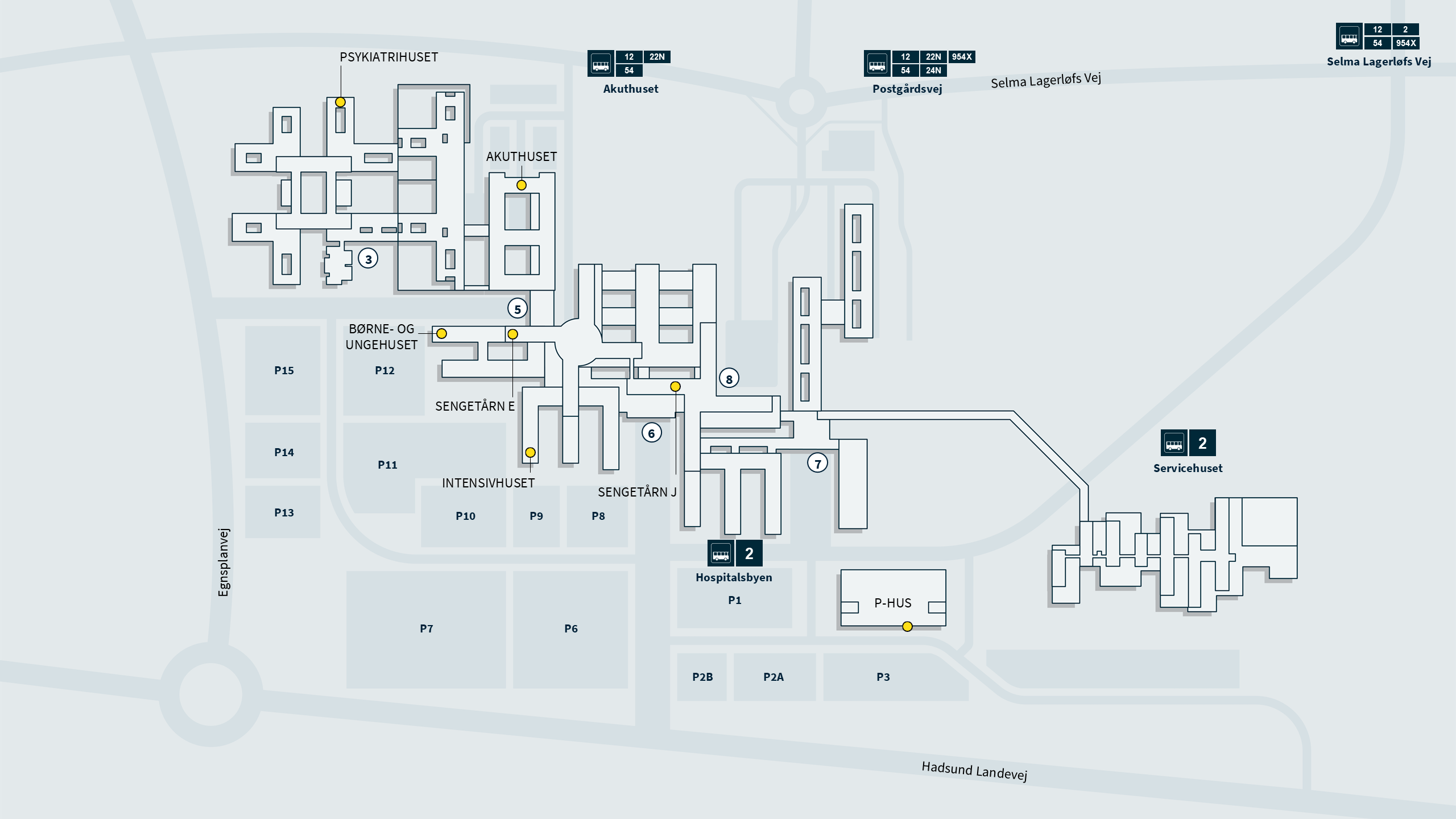 - Ankomst med offentlig transport: Hvis du benytter linje 2 til Hospitalsbyen, kan du køre lige til indgang 6. Stoppet hedder ”Hospitalsbyen”. Står du af ved "Akuthuset", "Postgårdsvej" eller "Selma Lagerløfsvej", kan du benytte indgang 8. Følg skiltningen mod det hus eller sengetårn, du skal i, når du kommer ind ad indgangen.